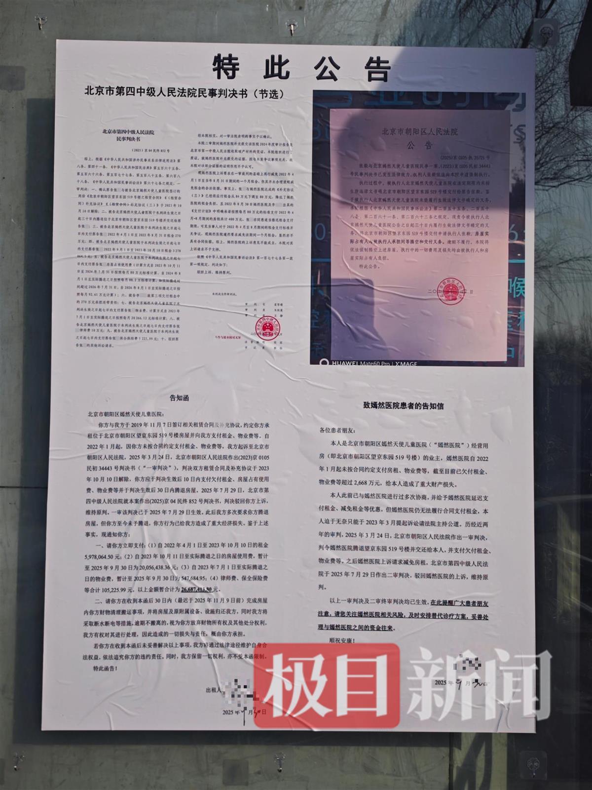14日,极目新闻记者来到位于北京朝阳区望京的嫣然天使儿童医院,医院正常营业中。医院门口,张贴告示一则,包括法院民事判决书、催促医院还款、搬迁的告知函及致医院患者的告知信,落款为出租人张先生。告示中提到,截至2025年9月,嫣然天使医院已拖欠租金、物业费超2668万元。医院工作人员回应,目前医院仍正常营业,患者可正常来就诊,“现在一切正常。如果哪天要搬了,我们会提前通知的。”